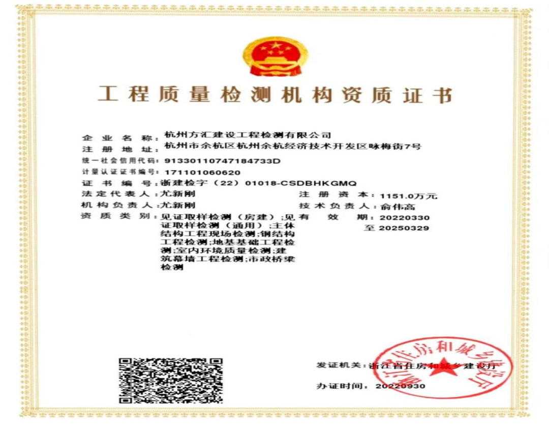 杭州方匯建設工程檢測有限公司成立以來,始終貫徹“科學管理、精準檢測、客觀公正、誠信服務”的質量方針,堅持以檢測機構“獨立、客觀、公正”的原則,為建設工程質量控制起到了積極的作用,歷年被建設行政管理部門評為年度優秀檢測機構,同時奉上“質量第一、服務至上”的經營理念,為廣大建設及施工單位提供高質量的檢測服務,受到各級行業管理部門考評專家及廣大客戶的一致好評。